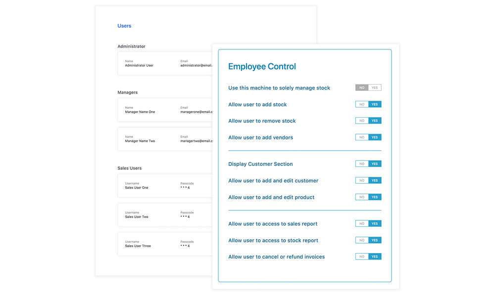 Restrict the features access of your employees depending on your employees. For example allow only a specific employee to give a sales discount or allow the employee to add a customer or a product.
